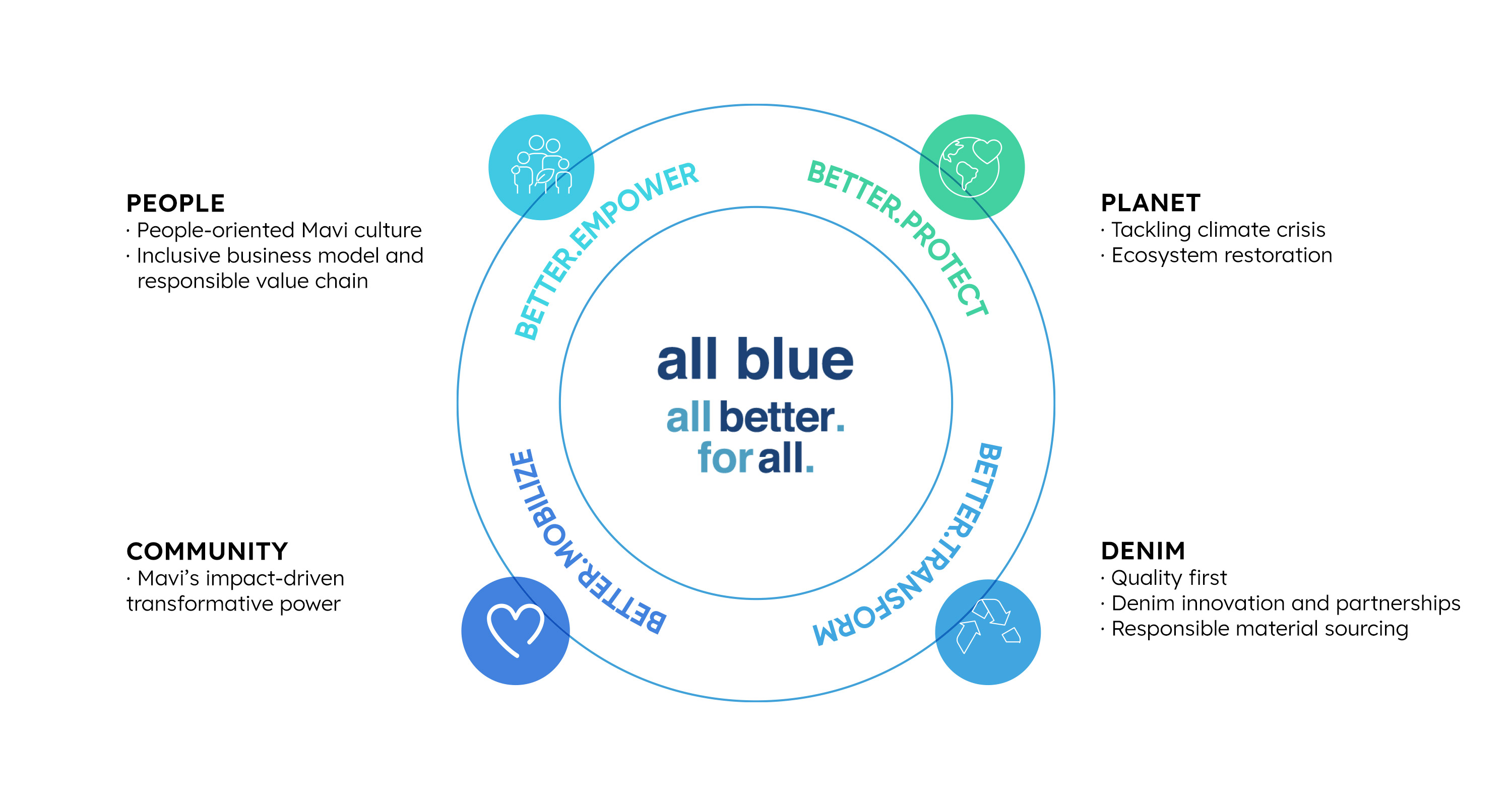 As part of its sustainability strategy and driven by its core values focused on people, planet, denim, and community, Mavi will: